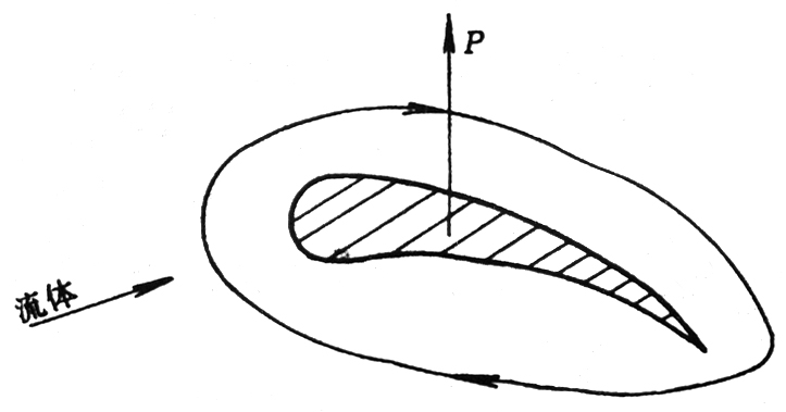 如圖7-21示。機翼上有一個順時針方向的環流運動;由於機翼向前運動,以流體相對於機翼來說作自左向右的平流運動。機翼上部平流與環流疊加流速加快,壓力降低;機翼下部平流與環流疊加流速減慢,壓力升高。這樣機翼上、下麵產生壓力差,此壓力差乘以機翼的麵積即為升力P。