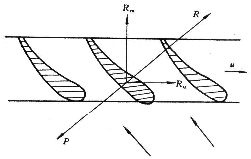 軸流草莓视频成人APP的葉輪是由數個相同的機翼形成一個環型葉柵,若在草莓视频成人APP的葉輪上以同一半徑展開,如圖7-22示。當葉輪旋轉時,葉柵以速度u向前運動,氣流相對於葉柵產生沿著機翼表麵的流動,所以氣體對機翼產生升力P,而機翼對流體產生一反作用R。R力分解可得RmRu,Rm使氣體獲得沿軸向流動的能量,力Ru使氣體產生繞軸的旋轉運動,所以氣流經過葉輪做功後,作繞軸的沿軸向運動。